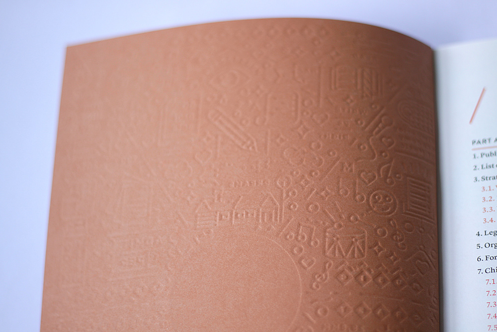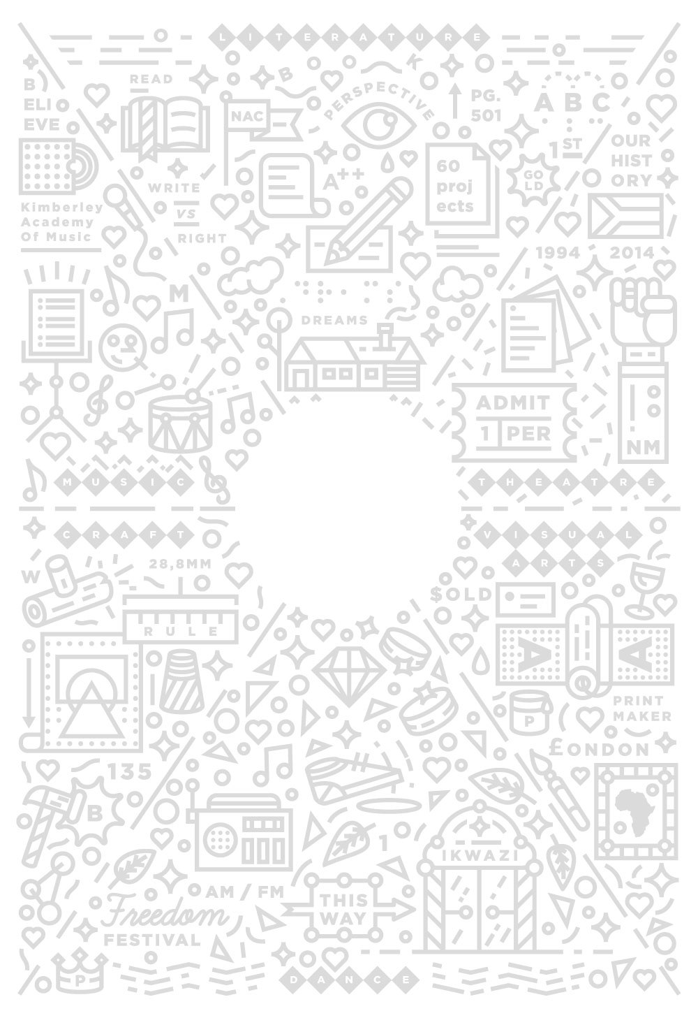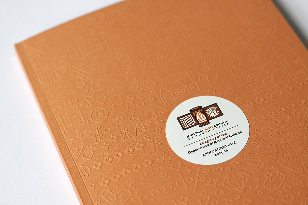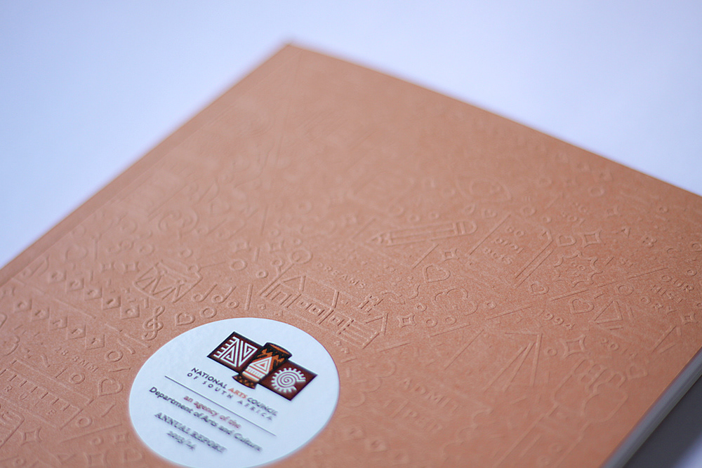 A blind emboss cover for The National Arts Council of South Africa. The cover depicted 6 different discplines of the Arts Council; namely, Literature, Craft, Visual Arts, Dance, Theatre and Music. Agency: Breinstorm